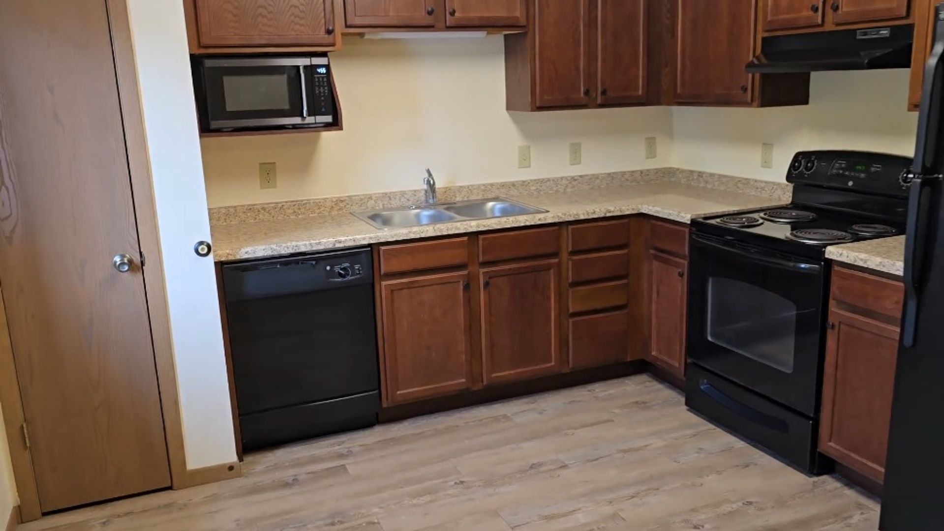 Full modern kitchen with refrigerator, oven, dishwasher, and microwave